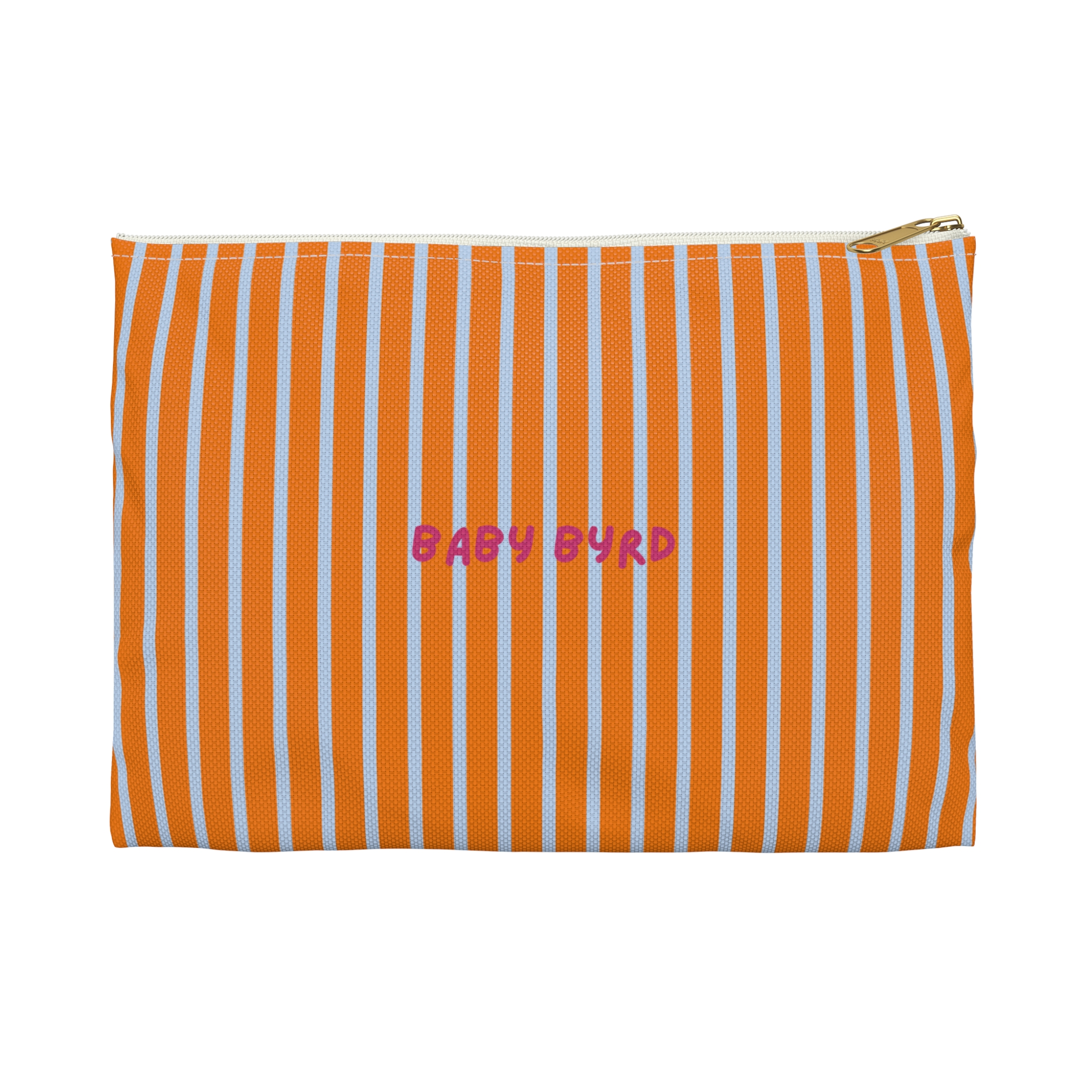 Stay organized in style with the Born to Be Fly Accessory Pouch by Baby Byrd. Featuring a fly blue and orange striped design, this versatile pouch is perfect as a cosmetic travel bag, pencil case, or everyday organizer. Made from durable material with a secure zipper closure, it’s designed to keep your essentials safe whether you’re at school, work, or on the go.